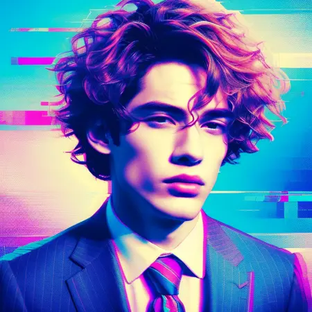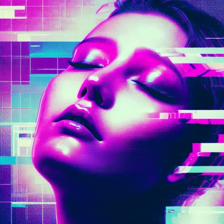 vaporwave style, Short-haired fashionable girl, wearing sunglasses, earrings, and a sweater, with a background of palm tree, and a sunset.lora:vaporwave:0.7