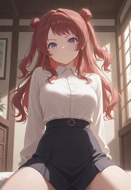 medium breasts, purple eyes, blue eyes, brown hair, red hair, long hair, skhnm