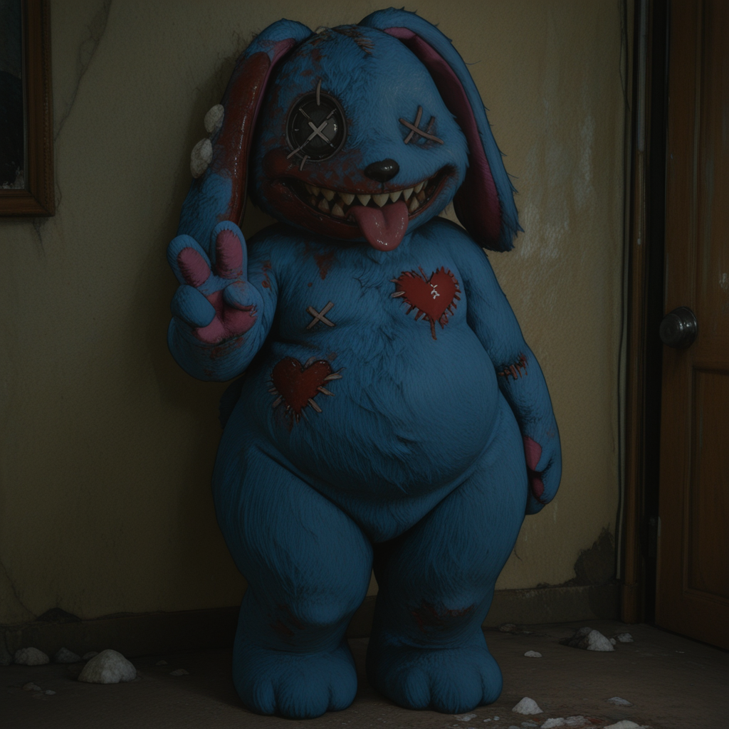 male, furry male, solo, stuffed toy, rabbit, blue fur, one button eye, black nose, sharp teeth, floppy ears, stitches, stitched heart, damaged, paw pads, rabbit tail, blood