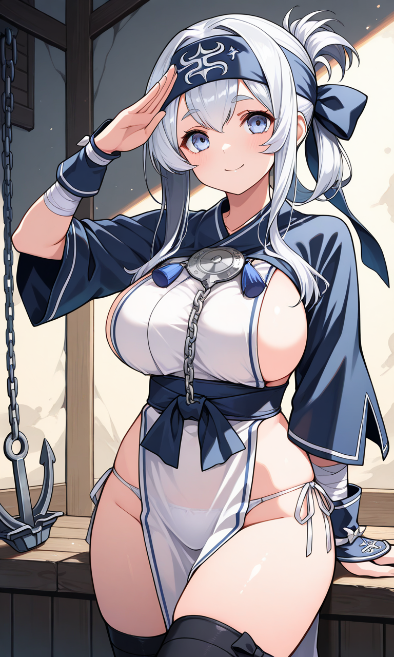 기본 복장: kamoiKC, 긴 머리카락, 긴 소매, 옆머리, 소매 없는, 검은 허벅지 긴 양말, 흰색 드레스, 측면 유방, 소매 없는 드레스, 머리띠, 체인, 붕대, 두꺼운 눈썹, 골반 커튼, 짧은 재킷, 접힌 단발머리, 밴다나, 닻, 아이누 복장, 팔보호대, 큰 가슴, 측면 매듭 팬티, 흰 팬티,