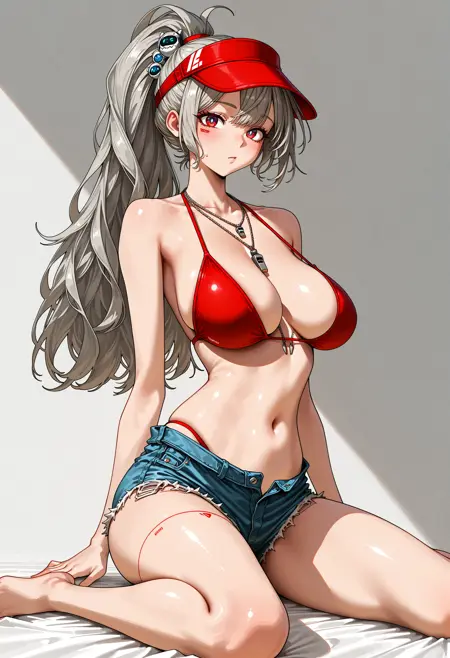 Recommended prompts are as follows:1girl, grey hair, red eyes, blue pupils, high ponytail, hair ornament, barcode, barcode tattoo