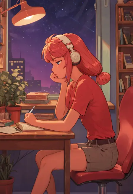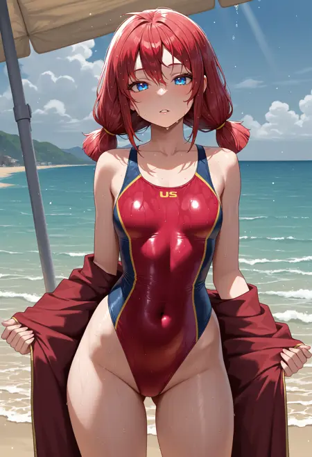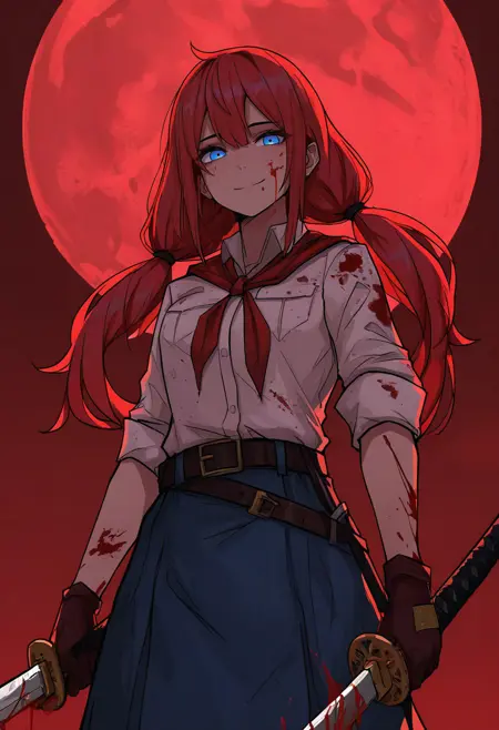 タグ - usstul、ミディアムヘア、赤髪、ローツインテール、青 eyes、1girl、ソロ、観察者を見つめる、タン
