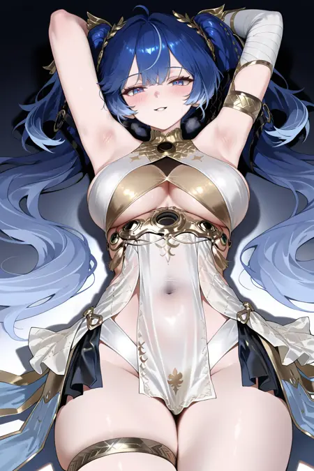iuno \(wuthering waves\), blue hair, blue eyes, 1girl, twintails, solo, long hair, very long hair, white dress, bridal gauntlets, jewelry, dress, ahoge, thighlet, bare shoulders, hair ornament, bracelet