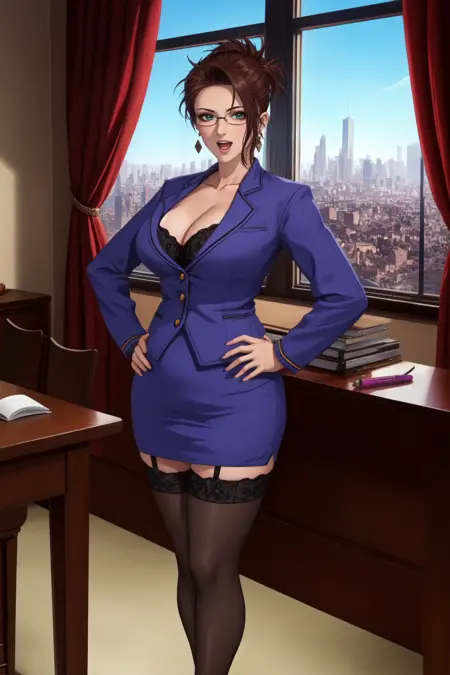 blazer, pencil skirt, black thighhighs, lace trim, high heels, black footwear, black bra