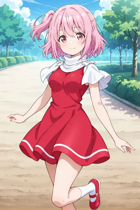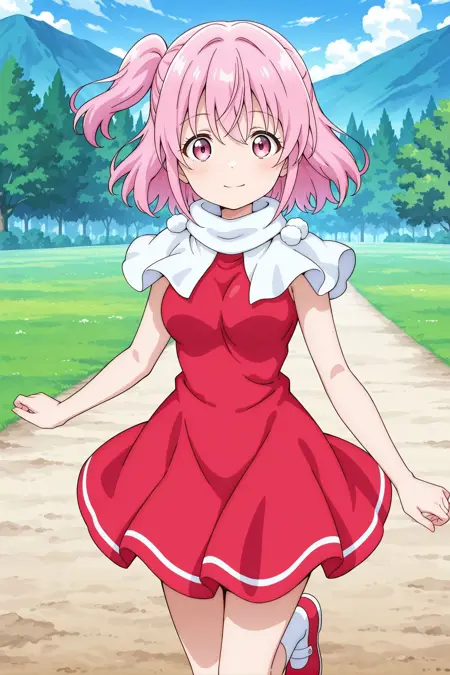 sara, 1girl, solo, pink eyes, pink hair, short hair, one side up, medium breasts,