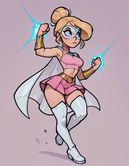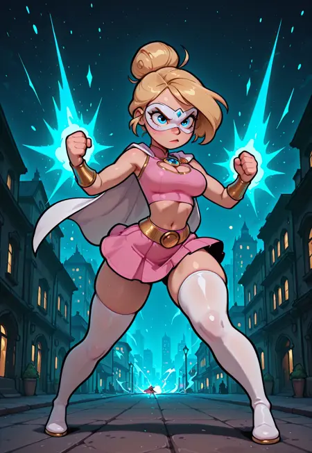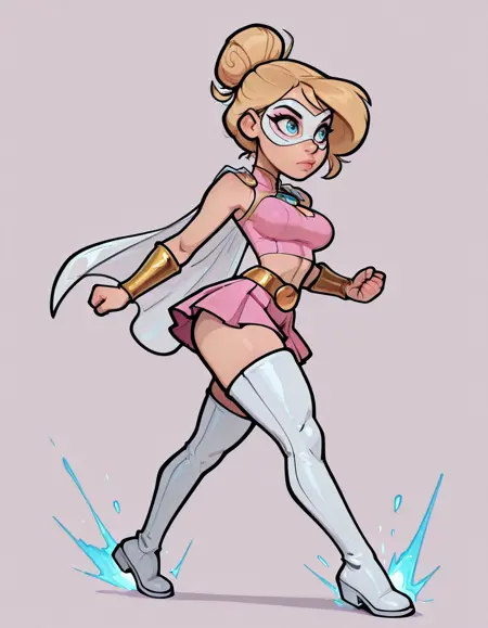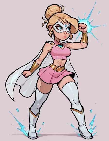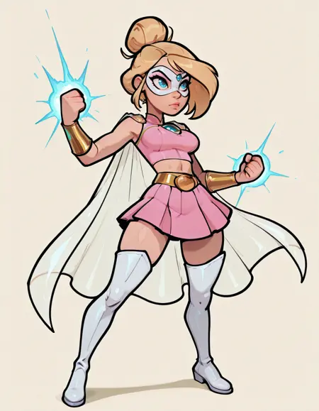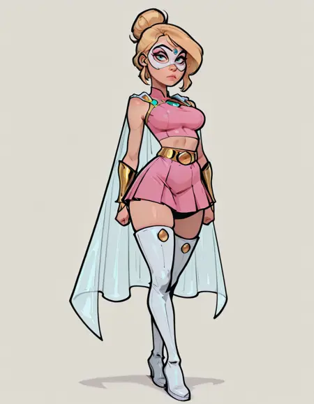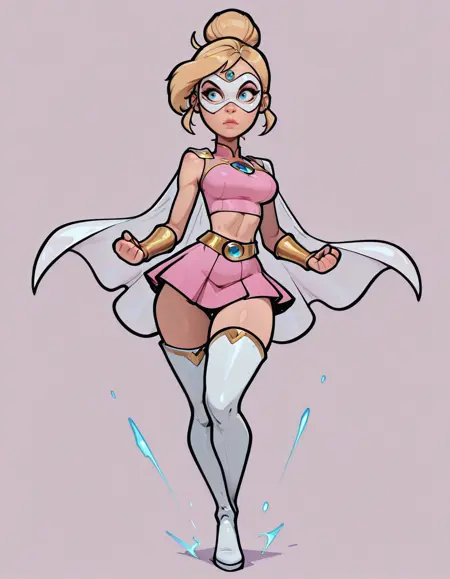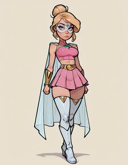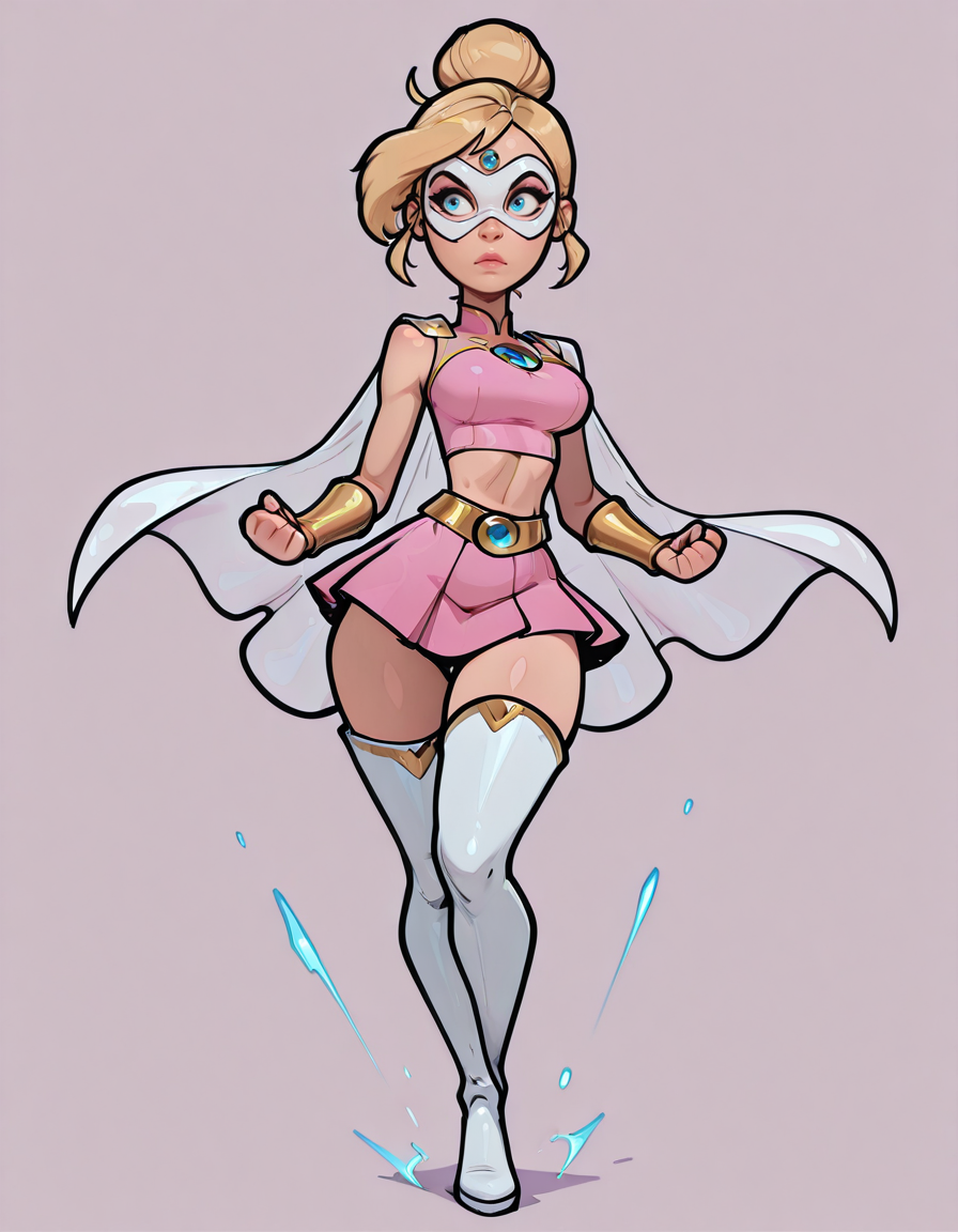 - 1girl, blonde hair, hair bun, blue eyes, white mask, cape, blue gem, pink crop top, cleavage cutout, pink skirt, gold wristbands, gold belt, white thighboots,