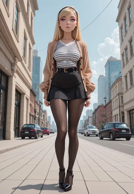 - 1girl,金色长发,直发,刘海侧分,黑色发带,蓝色眼睛,眼下有痣,棕色针织开衫,条纹衬衫,黑色腰带,黑色裙子,连裤袜,黑色高跟鞋,