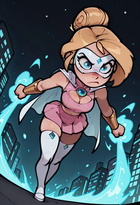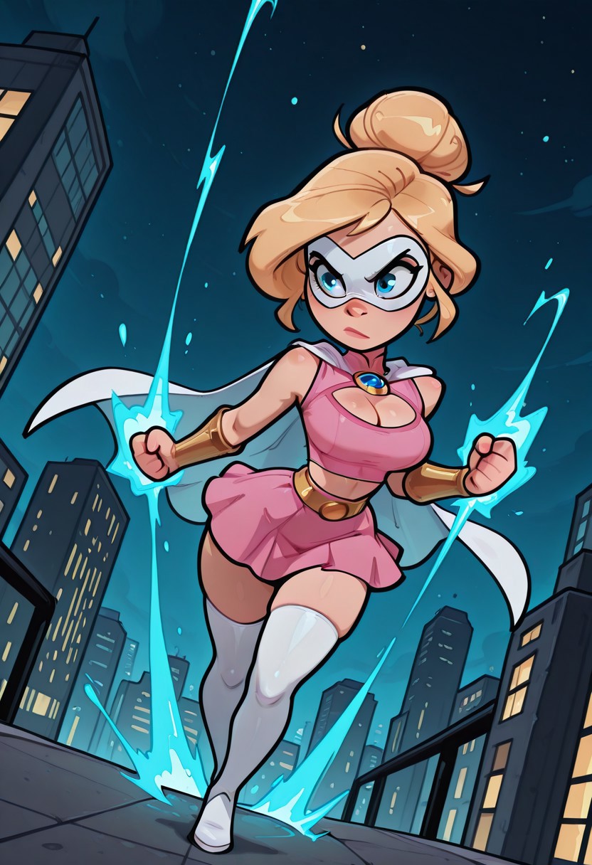 - 1girl,金色长发,发髻,蓝色眼睛,白色面具,斗篷,蓝色宝石,粉色露脐上衣,胸部开叉,粉色裙子,金色腕带,金色腰带,白色过膝长靴,