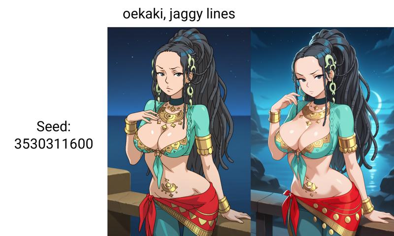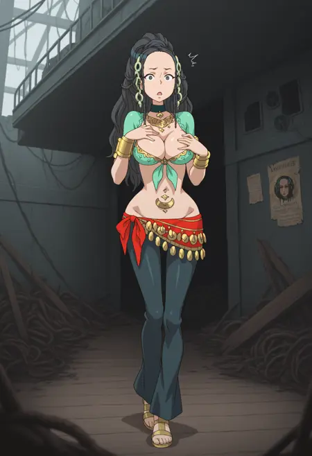 | 训练词汇 | lotutus, 1girl, large breasts, dark grey hair, long hair, hair pulled back, high ponytail, hair ornament, light green ornament, dreadlocks, dark grey eyes,已复制! dark green choker, front-tie top, multicolored shirt, cyan shirt, yellow shirt, crop top, cleavage, short sleeves, golden necklace, midriff, golden bracelet, golden armlet, navel piercing, golden crescent, groin, multicolored sarong, red sarong, yellow sarong, dark blue pants, bell-bottoms,已复制! high heels, golden sandals,已复制! |