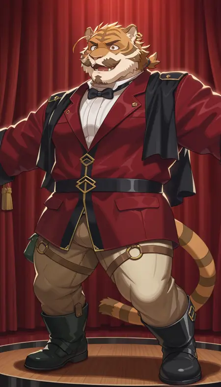 オークショナーの衣装:赤と黒のジャケット、白いカラー付きシャツ、黒いボウタイ、カーキパンツ、ブーツ、脚ストラップ、首周りの黒いサッシュ