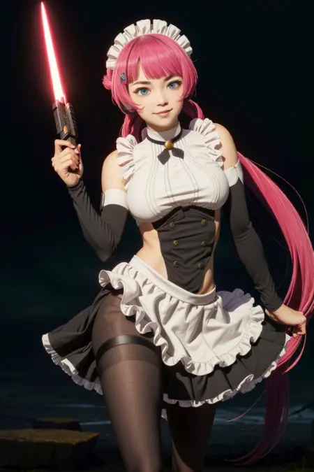 I haven't tried her with other LoRAs but her outfits are flexible enough to make me think combining them shouldn't be a problem. I trained her on her regular maid outfit and semi-nude. I didn't bake in most of her outfit so that she can be redressed, but this requires including them as prompts for accuracy (see triggers)