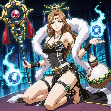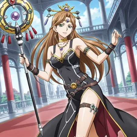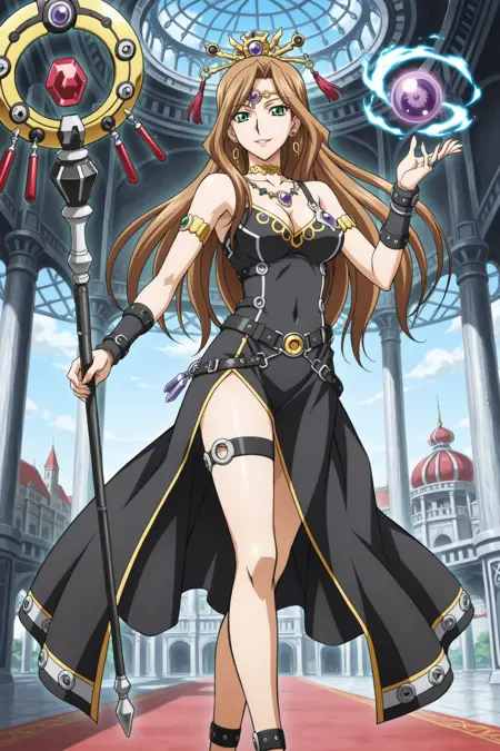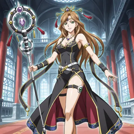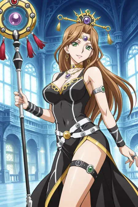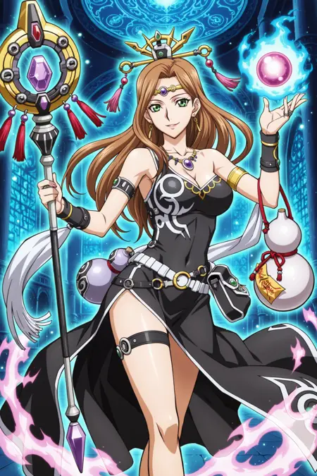 yugioh_card_style, yugioh_card_for_chaos_allure_queen, green eyes, brown hair, long hair, lips, earrings, necklace, large breasts, collarbone, covered navel, cleavage, smile, tiara, hair ornament, gold jewelry, black asymmetrical dress, skirt, gold trim, belts, leg harness, thigh straps, shoulderless outfit, futuristic design, metallic rings, gemstone decorations, arm bands, staff, ornate staff, magic staff, purple gem, red brush tip, mechanical details, bare feet