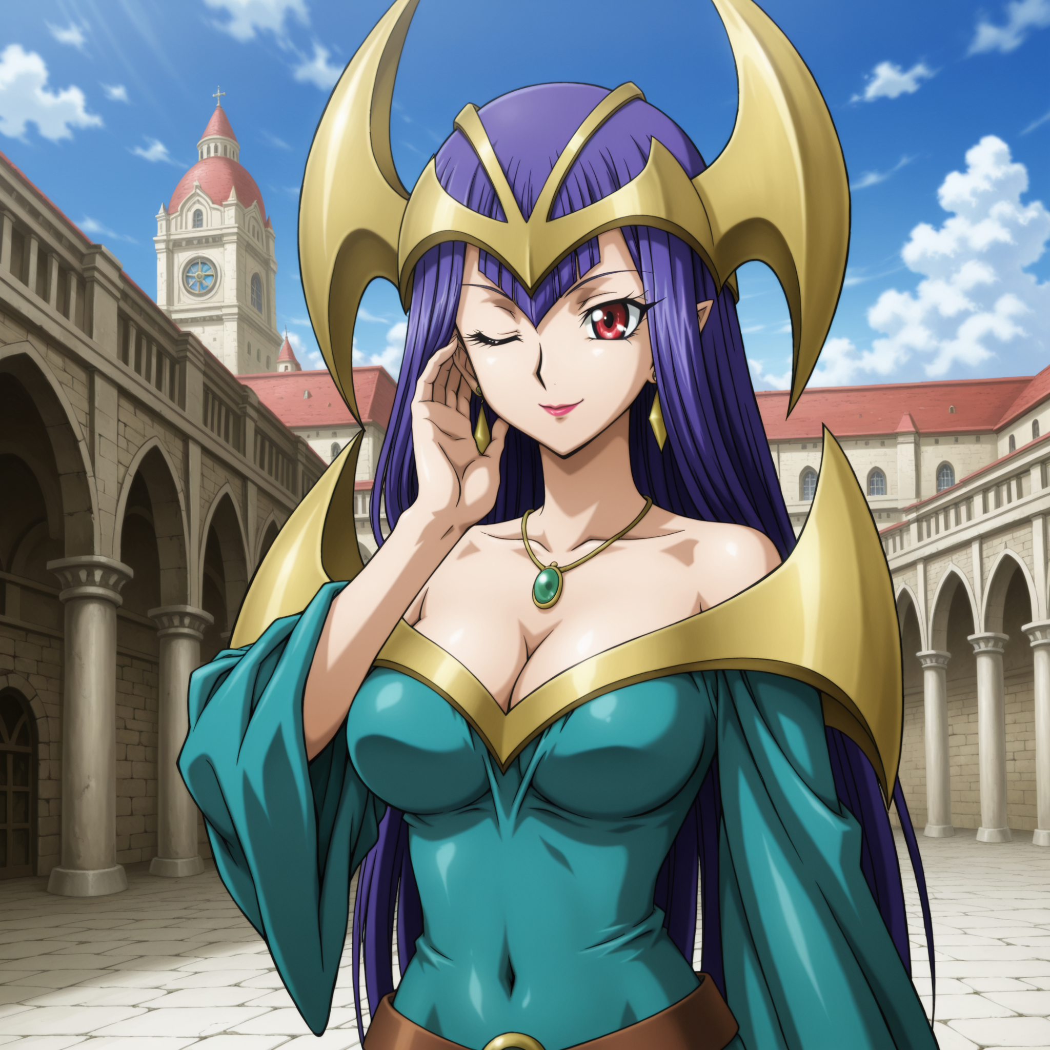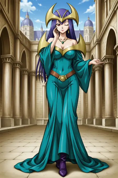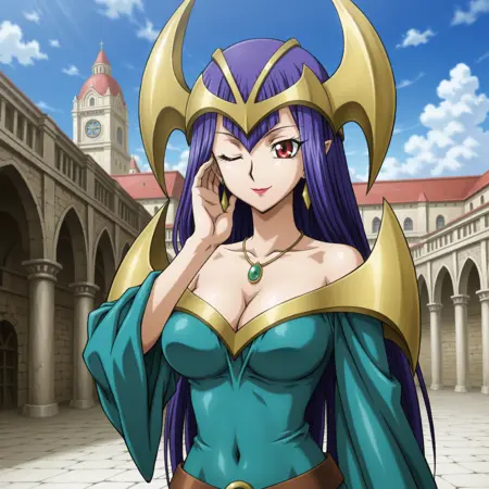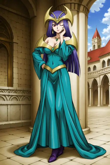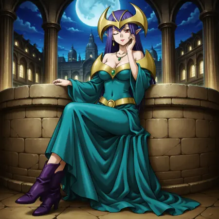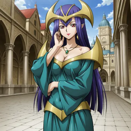 yugioh_card_style, yugioh_card_for_dark_elf, red eyes, purple hair, long hair, straight hair, lipstick, earrings, necklace, large breasts, collarbone, covered navel, cleavage, smile, gold crown, ornate headpiece, curved horns, gold shoulder, teal robe, oversized sleeves, no belt, purple high heel boots, hand on cheek, thoughtful pose