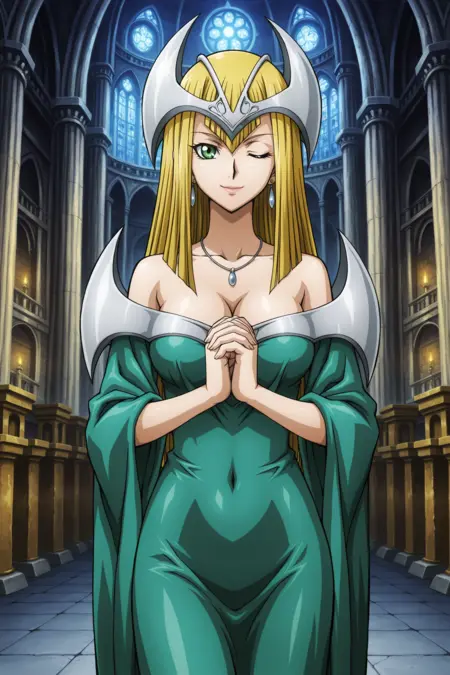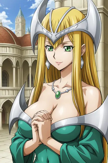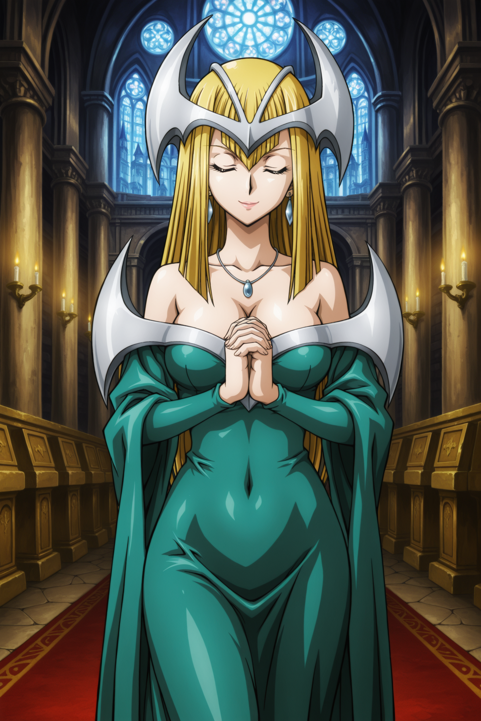 yugioh_card_style, yugioh_card_for_mystical_elf, green eyes, blonde hair, long hair, straight hair, lips, earrings, necklace, large breasts, collarbone, covered navel, cleavage, smile, silver crown, horned crown, organic-shaped headpiece, stylized helm, symmetrical headgear, silver shoulders, green dress, no belt, boots, praying