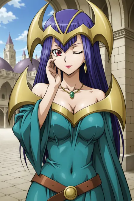 yugioh_card_style, yugioh_card_for_dark_elf, 红色眼睛, 紫色头发, 长发, 直发, 口红, 耳环, 项链, 大胸, 锁骨, 覆盖的肚脐, 乳沟, 微笑, 金色王冠, 华丽头饰, 弯曲犄角, 金色肩甲, 青绿色长袍, 超大袖子, 无腰带, 紫色高跟长靴, 手托脸颊, 沉思姿态