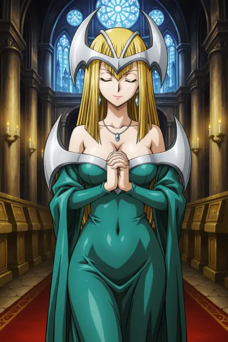 yugioh_card_style, yugioh_card_for_mystical_elf, 绿色眼睛, 金色头发, 长发, 直发, 嘴唇, 耳环, 项链, 大胸, 锁骨, 覆盖的肚脐, 乳沟, 微笑, 银色王冠, 有角王冠, 有机形状头饰, 风格化头盔, 对称头饰, 银色肩甲, 绿色长裙, 无腰带, 靴子, 合掌祈祷