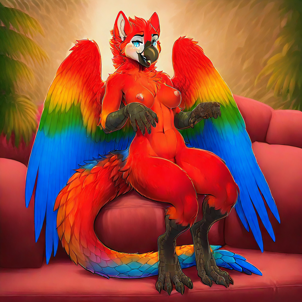 Luna(character), hybrid, anthro, furry, red body, multicoloured wings, talons, tail, blue eyes,