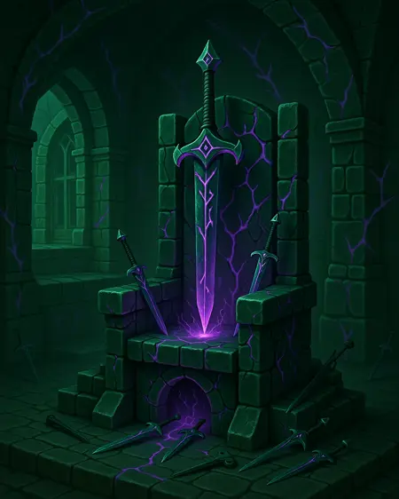 어두운, 기이한 지하감옥 장면. 돌로 된 벽난로에서 빛나는 보라색 불꽃이 솟아오른다. 방은 녹빛으로 희미하게 밝혀져 있고, 균열 난 돌벽과 배경의 아치형 문이 보인다. 중앙에는 큰 화려한 검이 돌로 된 왕좌 위에 서 있으며, 검날은 깊은 보라색 빛을 발산한다. 검은 왕좌 중앙에 놓여 있고, 손잡이는 관찰자 쪽을 향하고, 검날은 오른쪽으로 향해 있다. 왕좌는 돌로 만들어졌으며, 여러 개의 검이 놓여 있고, 일부는 부서져 주변에 흩어져 있어 장면에 위협적인 분위기를 더한다. 전체적인 분위기는 어둡고 불길하며, 신비와 매력의 감각을 준다.