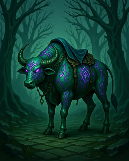 측면에서 촬영한 디지털 일러스트레이션: 보라색 무늬가 빛나는 신화적 생물이 안개 낀 숲 속 자갈길 위에 서 있는 장면. 이미지에는 어두운, 기이한 분위기와 배경의 들판 나무가 보인다. 중앙에는 큰 근육질의 녹색 피부를 가진 수소가 보이며, 머리는 관찰자 쪽을 향해 돌아서 있다. 수소는 둥근 뿔 두 개와 푸른 천으로 덮인 안장이 있으며, 정교한 무늬가 새겨져 있고 목에 사슬이 매달려 있다. 눈은 신비로운 기운을 띠고 빛나며 초현실적인 분위기를 준다. 땅은 불균등하고 풍화되어 있으며, 자갈이 곳곳에 흩어져 있다. 전체적인 분위기는 어둡고 신비롭으며, 판타지의 흔적이 느껴진다.