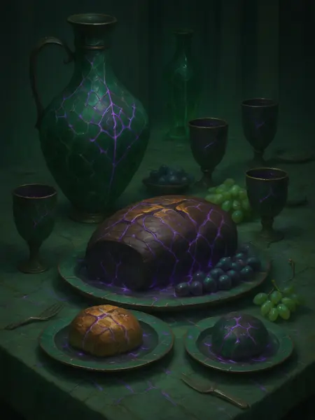 A digital illustration shoot from a frontal camera angle about a glowing green wolf standing in a dark forest. the image also shows intricate patterns on its fur and glowing purple lines. on the middle of the image, a lone wolf appears to be standing, with its full body facing the viewer. the wolf has a muscular build and is covered in a textured, moss-like material, giving it a mystical appearance. its fur is a vibrant green color, and its eyes are a striking purple, standing out against the dark, foggy background with tall, dark trees and moss-covered ground. - A digital illustration shoot from the front about a still life of a table set up for a meal with glowing purple and green patterns, featuring a variety of food items arranged on a stone tablecloth in a dimly lit, rustic setting. the table is set with plates, glasses, and a large, ornate vase, and the tablecloth is covered with a textured, moss-like material. in the center of the table, a large loaf of bread with cracked purple skin sits on a plate, surrounded by smaller, round, green grapes. the bread appears to be freshly baked, with a golden crust and a slightly crisp crust. the grapes are scattered around the plates, adding a touch of texture and color to the scene. on the left side of the image, there is a tall, slender vase with a handle, and on the right side, there are two smaller, empty cups. the background features a glowing green crystal structure, which adds to the eerie atmosphere of the scene, creating a sense of depth and mystery. the overall mood is dark and moody, evoking a feeling of mystery and intrigue.