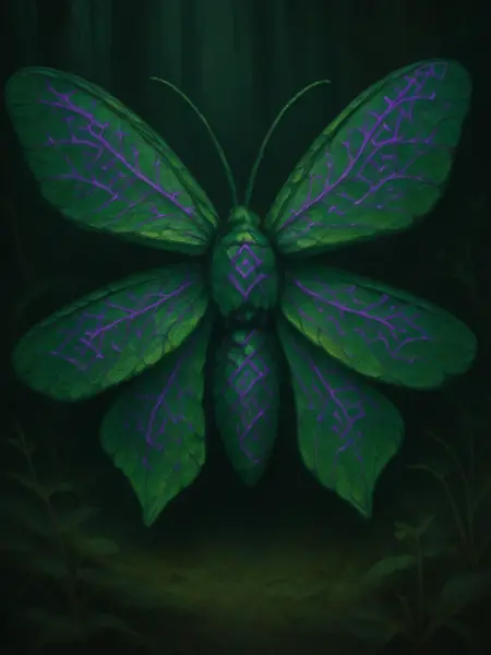 — 一张正面视角的数字插画,描绘一张用于用餐的静物餐桌,桌布为石质纹理,布满发光的紫色与绿色图案,置于昏暗古朴的环境中。桌上摆放盘子、玻璃杯与一个大型 ornate 花瓶,桌布覆盖着类似苔藓的纹理。中央盘中放置一块表皮开裂的紫色面包,周围散落着小而圆的绿色葡萄。面包看似刚出炉,金黄酥脆的外皮微微发亮。葡萄散布在盘子周围,增添纹理与色彩。画面左侧为一个高而细、带把手的花瓶,右侧为两个较小的空杯。背景是发光的绿色水晶结构,强化了场景的诡异氛围,营造出深度与神秘感。整体情绪阴暗而深沉,唤起神秘与好奇之感。一张数字插画,描绘一只在黑暗森林背景中展翅的发光绿蛾,翅膀上布满精细的紫色图案。蛾体位于画面中央,双翼完全展开,展现其复杂纹路。身体以绿色为主,贯穿紫色静脉,造型独特引人注目。背景模糊,隐约可见绿色植被,营造出深度与神秘感。整体氛围神秘而迷人,蛾体在暗黑背景中尤为突出。