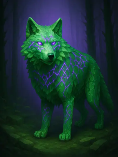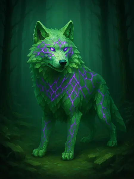 一张正面视角的数字插画,描绘一只在黑暗森林中站立的发光绿狼。图像中其皮毛上布满精细图案与发光的紫色线条。画面中央,一只孤狼正全面向观众站立,体型健壮,全身覆盖类似苔藓的纹理,呈现出神秘气质。其毛色为鲜艳的绿色,双眼为醒目的紫色,与黑暗迷雾背景中高耸的暗树与苔藓覆盖的地面形成强烈对比。