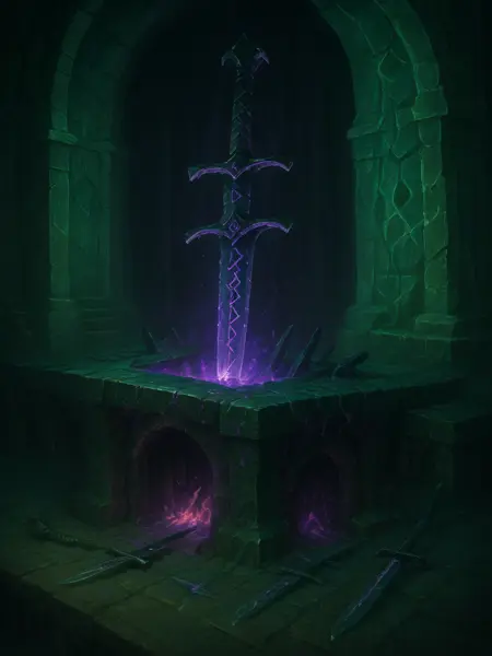 — 一个黑暗诡异的地下洞穴场景,岩壁上有一座石制壁炉,从中冒出发光的紫色火焰。房间被绿色调的微光笼罩,墙壁布满裂痕,后方为拱形通道。画面中央,一把大型 ornate 剑立于石制王座之上,剑刃泛着深紫色的光芒。剑身位于王座正中,剑柄朝向观众,剑尖指向画面右侧。王座由岩石制成,上面摆放着数把剑,部分断裂散落,加剧了场景的不祥氛围。整体情绪阴暗而压抑,充满神秘与悬念。一张低角度视角的超现实数字插画,描绘黑暗翡翠绿色环境中崩塌的石质结构。画面展现广袤崎岖的岩地,中央迸发出发光的紫色闪电,营造出深度与神秘感。画面中央,一个巨大而威严的结构悬浮于大小不一的岩石之间,顶端呈尖塔状。该结构周围环绕着更多尖锐、破碎的建筑,仿佛正在不断坍塌,强化了混乱与毁灭的氛围。背景为深邃的暗绿色,散布着大小不一的光点,宛如星夜。整体效果为一片广阔而混乱的空间,崩塌结构与闪电效应共同营造出空灵而神秘的氛围。