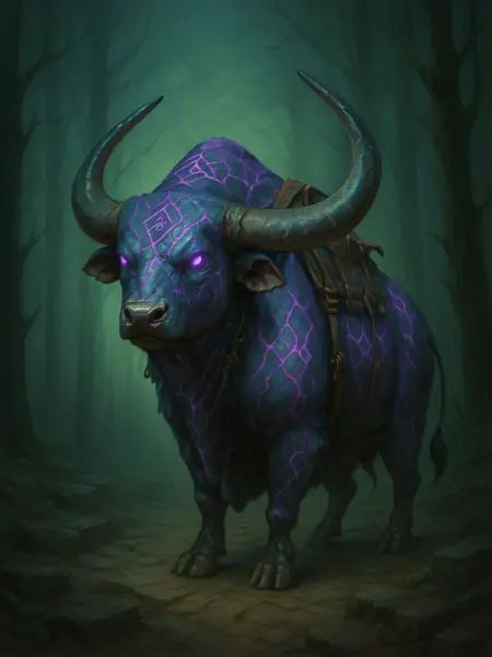 一张侧视角的数字插画,描绘一只神话生物,身披发光的紫色图案,伫立于迷雾森林中的鹅卵石小径上。背景为阴暗诡异的枯树。画面中央,一只肌肉发达、皮肤呈绿色的野牛站立,头部转向观众,生有弯曲的角,背上覆有蓝色布料制成的鞍具,全身装饰着精细图案,颈部系有铁链。双眼散发神秘光辉,赋予其超凡气质。地面凹凸不平,布满鹅卵石。整体情绪阴暗而神秘,略带奇幻色彩。