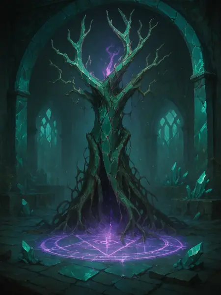 어두운, 기이한 지하감옥 장면. 돌로 된 벽난로에서 빛나는 보라색 불꽃이 솟아오른다. 방은 녹빛으로 희미하게 밝혀져 있고, 균열 난 돌벽과 배경의 아치형 문이 보인다. 중앙에는 큰 화려한 검이 돌로 된 왕좌 위에 서 있으며, 검날은 깊은 보라색 빛을 발산한다. 검은 왕좌 중앙에 놓여 있고, 손잡이는 관찰자 쪽을 향하고, 검날은 오른쪽으로 향해 있다. 왕좌는 돌로 만들어졌으며, 여러 개의 검이 놓여 있고, 일부는 부서져 주변에 흩어져 있어 장면에 위협적인 분위기를 더한다. 전체적인 분위기는 어둡고 불길하며, 신비와 매력의 감각을 준다.