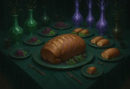 — 一张正面视角的数字插画,描绘一张用于用餐的静物餐桌,桌布为石质纹理,布满发光的紫色与绿色图案,置于昏暗古朴的环境中。桌上摆放盘子、玻璃杯与一个大型 ornate 花瓶,桌布覆盖着类似苔藓的纹理。中央盘中放置一块表皮开裂的紫色面包,周围散落着小而圆的绿色葡萄。面包看似刚出炉,金黄酥脆的外皮微微发亮。葡萄散布在盘子周围,增添纹理与色彩。画面左侧为一个高而细、带把手的花瓶,右侧为两个较小的空杯。背景是发光的绿色水晶结构,强化了场景的诡异氛围,营造出深度与神秘感。整体情绪阴暗而深沉,唤起神秘与好奇之感。一张数字插画,描绘一只在黑暗森林背景中展翅的发光绿蛾,翅膀上布满精细的紫色图案。蛾体位于画面中央,双翼完全展开,展现其复杂纹路。身体以绿色为主,贯穿紫色静脉,造型独特引人注目。背景模糊,隐约可见绿色植被,营造出深度与神秘感。整体氛围神秘而迷人,蛾体在暗黑背景中尤为突出。