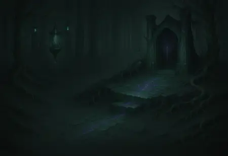 — 一个黑暗诡异的地下洞穴场景,岩壁上有一座石制壁炉,从中冒出发光的紫色火焰。房间被绿色调的微光笼罩,墙壁布满裂痕,后方为拱形通道。画面中央,一把大型 ornate 剑立于石制王座之上,剑刃泛着深紫色的光芒。剑身位于王座正中,剑柄朝向观众,剑尖指向画面右侧。王座由岩石制成,上面摆放着数把剑,部分断裂散落,加剧了场景的不祥氛围。整体情绪阴暗而压抑,充满神秘与悬念。一张低角度视角的超现实数字插画,描绘黑暗翡翠绿色环境中崩塌的石质结构。画面展现广袤崎岖的岩地,中央迸发出发光的紫色闪电,营造出深度与神秘感。画面中央,一个巨大而威严的结构悬浮于大小不一的岩石之间,顶端呈尖塔状。该结构周围环绕着更多尖锐、破碎的建筑,仿佛正在不断坍塌,强化了混乱与毁灭的氛围。背景为深邃的暗绿色,散布着大小不一的光点,宛如星夜。整体效果为一片广阔而混乱的空间,崩塌结构与闪电效应共同营造出空灵而神秘的氛围。