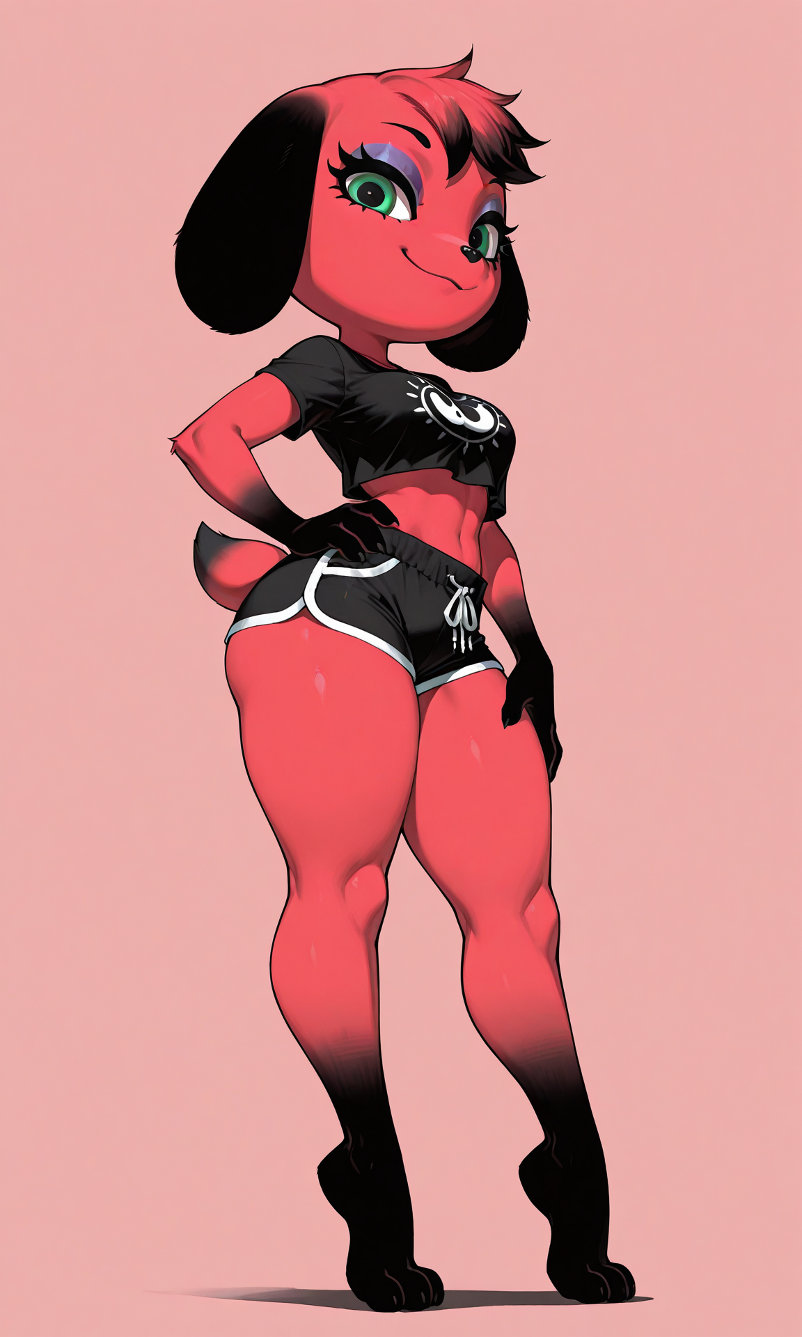 furry, animal nose, 1girl, shorts, crop top, animal crossing, green eye, multicolor fur red and black, small tail, floppy ears