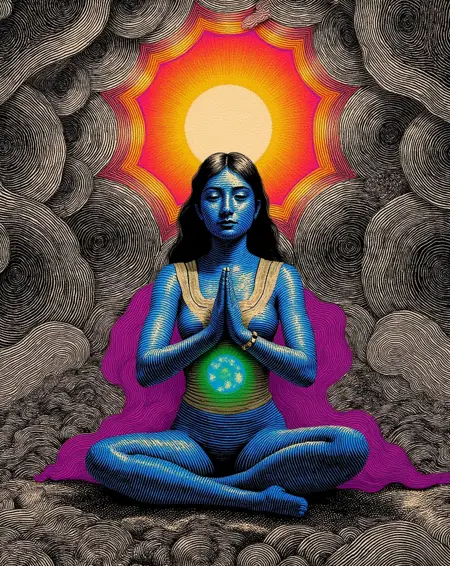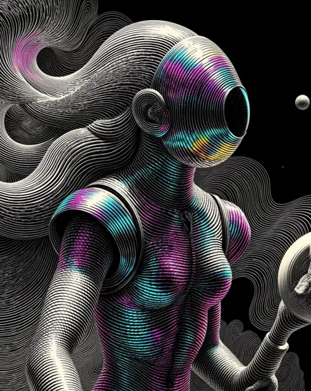 モノクロ(白黒)のパレットを使用し、深さと立体感は線の密度と方向にのみ依存。