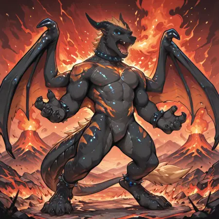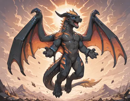 kaleth, anthro, solo, male, dragon, muscular, black scales, grey countershading, pecs, abs, wings, membranous wings, scuted tail, tail tuft, black horn, chin spikes, ears, fangs, saber teeth, 5 fingers, claws, biped, digitigrade, 4 toes, dewclaw, blonde hair, blonde eyebrows, blue eyes, black sclera, slit pupils, orange stripes, long stripes