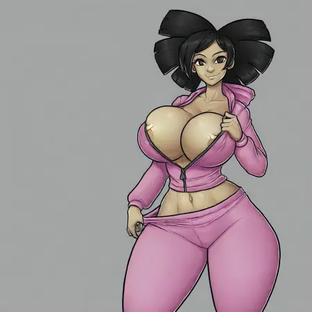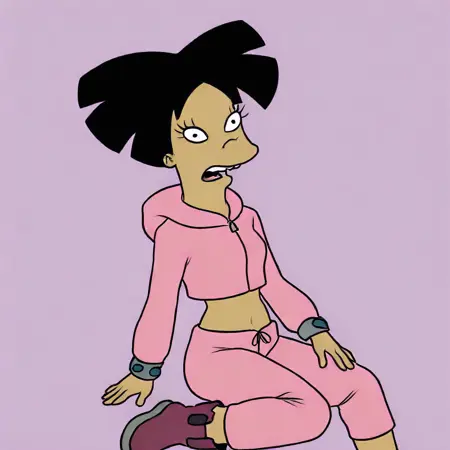 (amy wong (futurama), asian descent, short black hair, black eyes, fair skin, pink cropped hoodie, pink sweatpants, red buckle boots, big eyes, slim waist, thick legs).