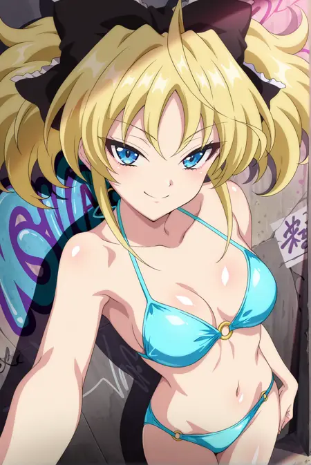 Basic: mittelt, 1girl, blue eyes, blonde hair, twintails, short hair, black hair bow