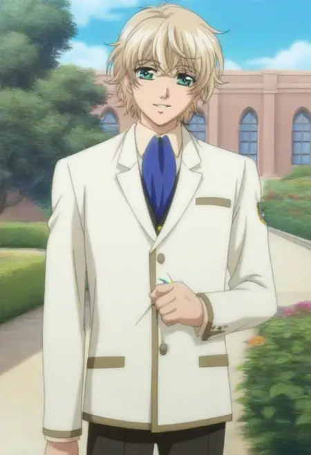 Keiichi Shimizu, blonde hair, green-blue eyes, school uniform, white blazer, collared undershirt, blue ascot necktie, black-green pants