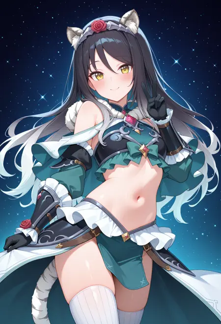 pcrshio, animal ears, animal ear fluff, black hair, gradient hair, yellow eyes, tiger tail, striped tail,