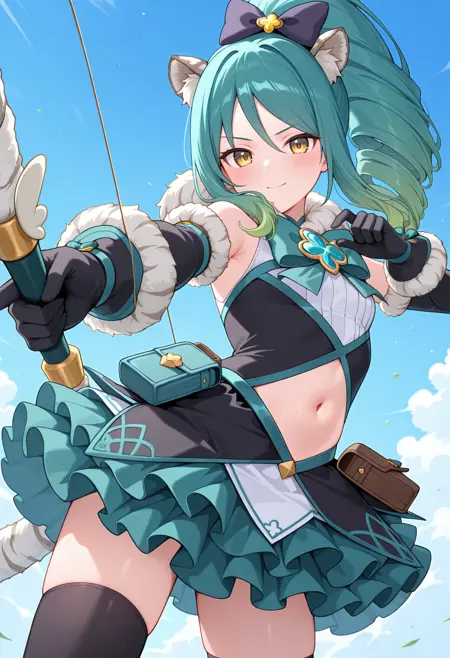 - pshiomag, green hair, aqua hair, very long hair, ponytail, drill hair, magical girl, hair bow, fur collar, sleeveless dress, bowtie, club \(shape\), jewelry, white shirt, black dress, frills, stomach cutout, fur-trimmed gloves, black gloves, elbow gloves, pouch, frilled skirt, layered skirt, green skirt, black thighhighs, < remove black hair from main prompt