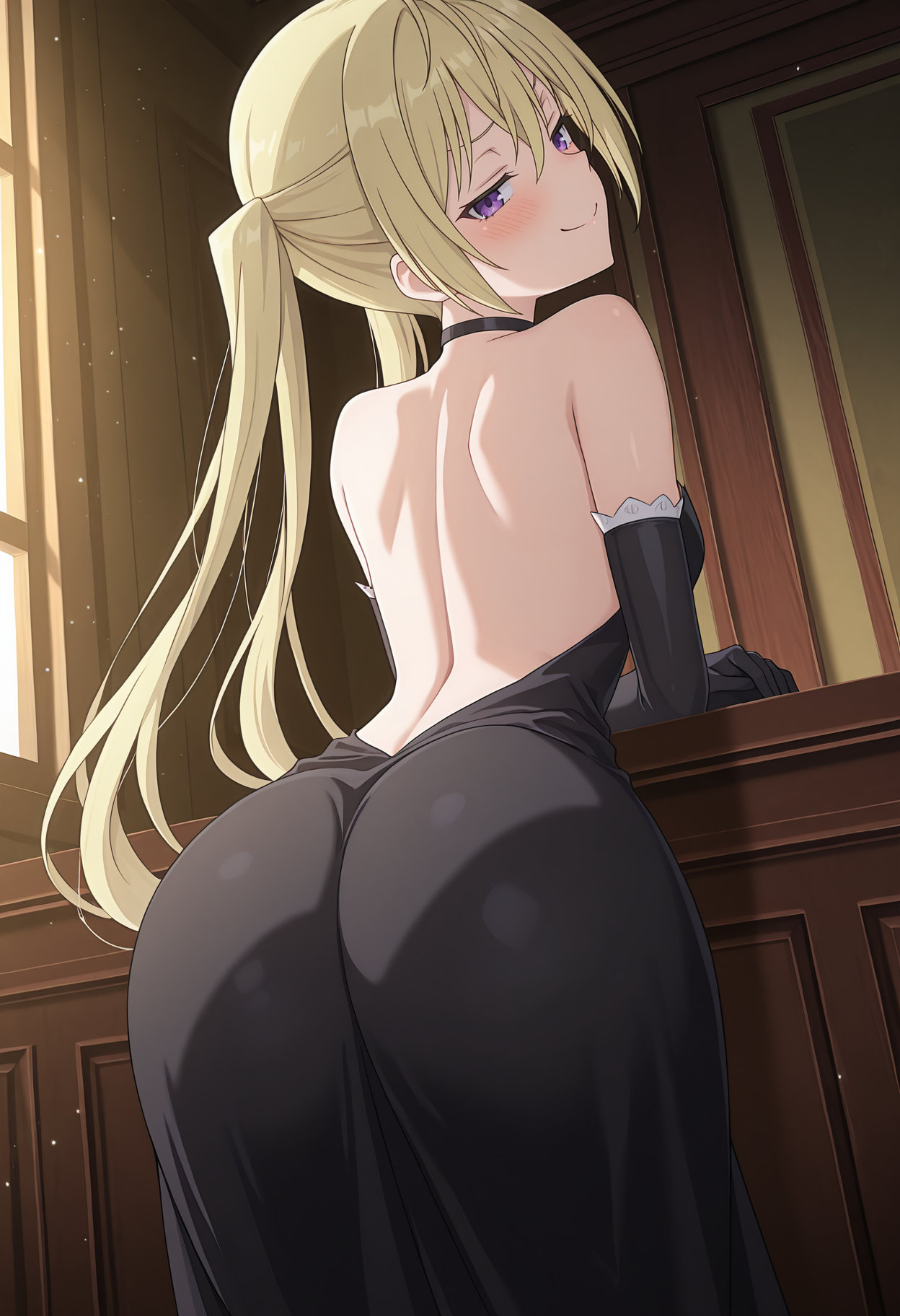 黑色连衣裙,黑色吊带背心,项圈,黑色手套,肘部手套,遮盖臀部,露背连衣裙,