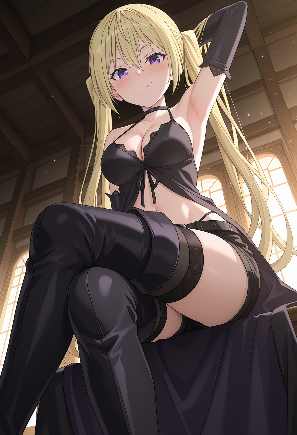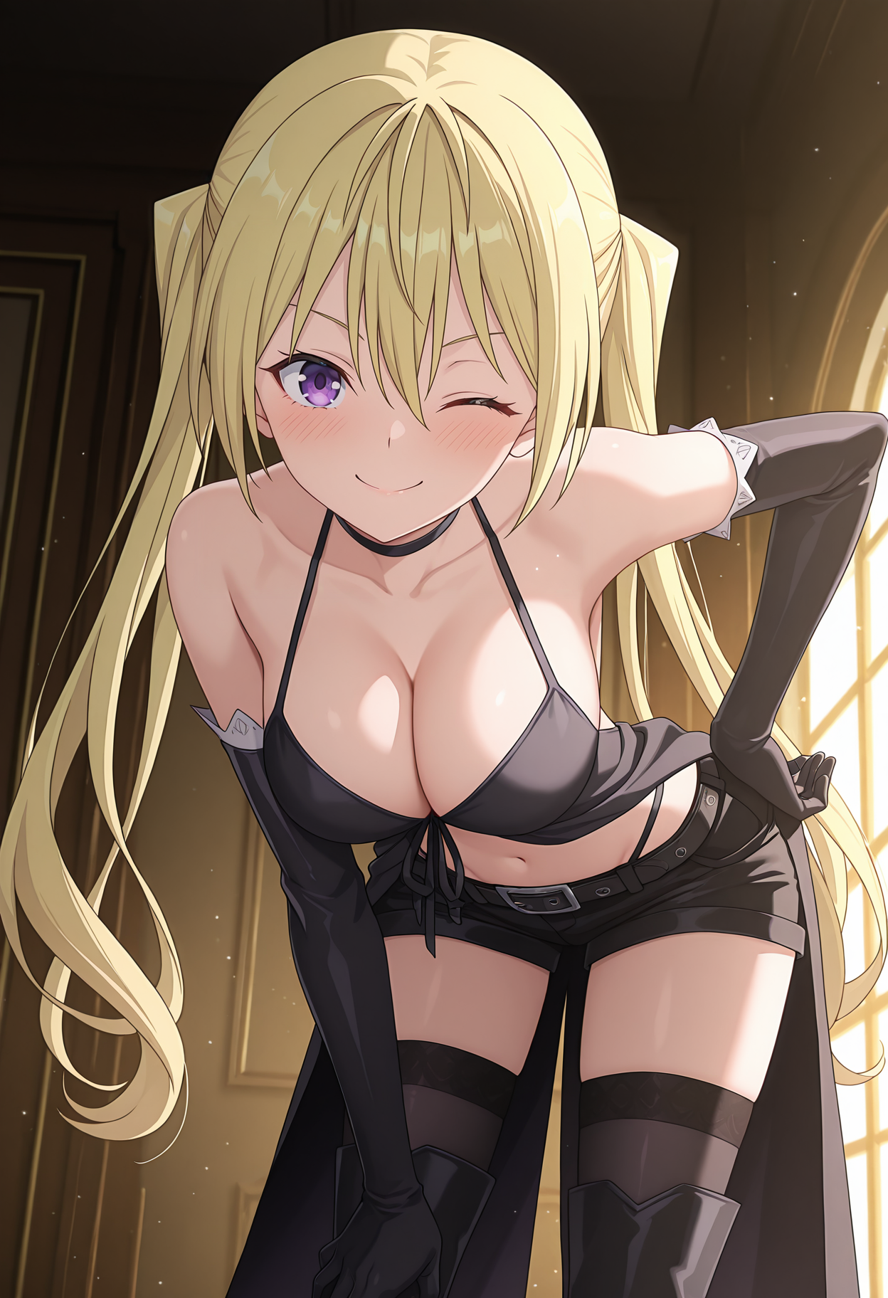 黑色连衣裙,黑色吊带背心,露肩设计,项圈,露出胸脯,露脐,黑色手套,肘部手套,腰带,短裤,黑色短裤,黑色过膝袜,大腿靴,