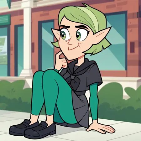 앨미리아, 뾰족한 귀, 녹색 눈, 짧은 연한 녹색 머리, 따뜻한 창백한 피부,