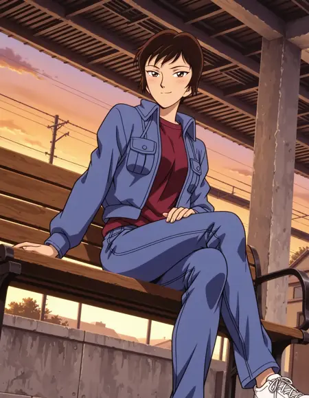 black hair,brown hair,tsurime,very short hair,blue jacket,collared jacket,open jacket,open clothes,pocket,denim jacket,denim jacket,long sleeves,red shirt,jeans,blue pants,white sneakers,tomboy,