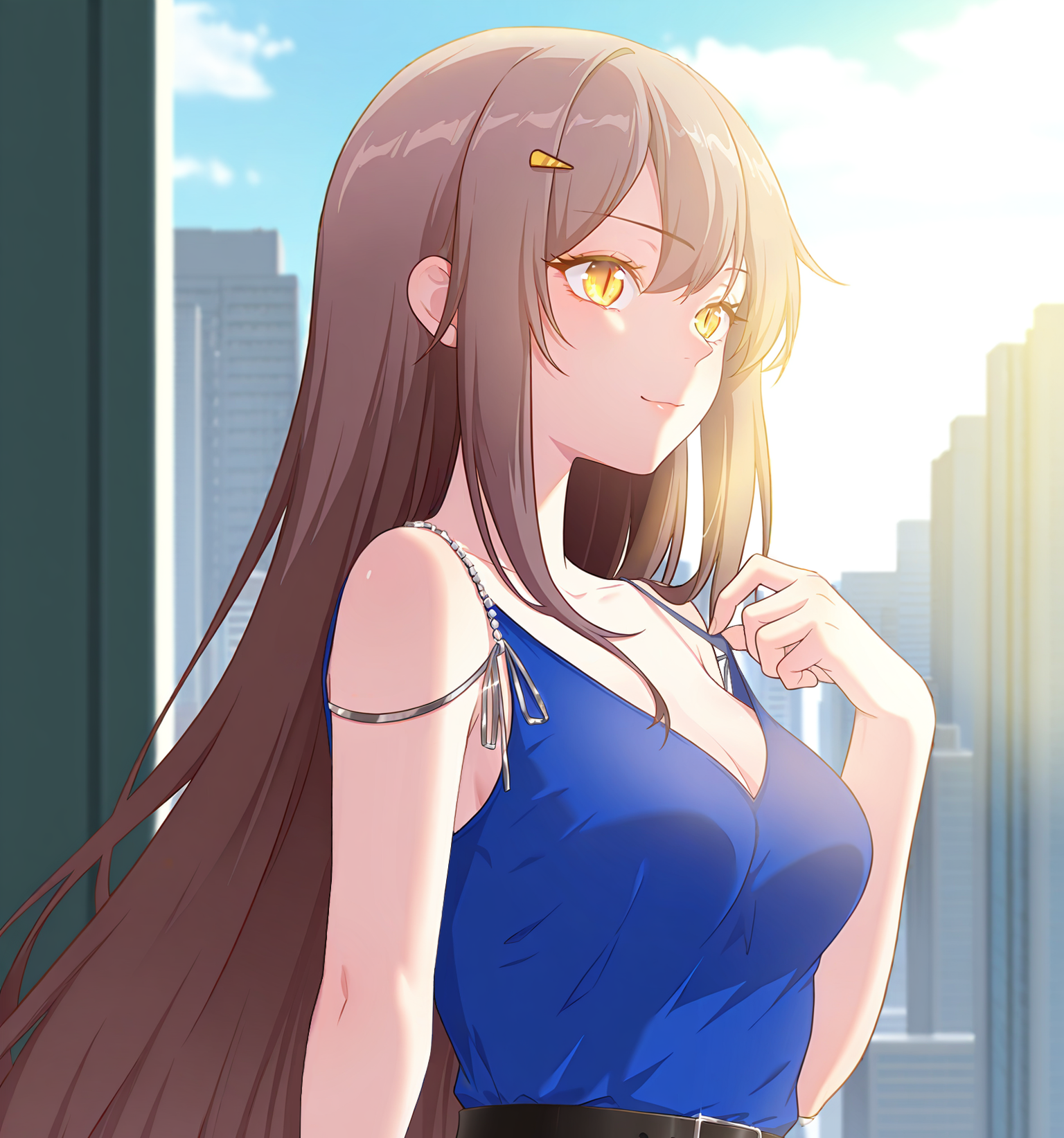 青いドレス、黒いベルト、ノースリーブドレス、1つの黄色いヘアクリップ、ストラップデザイン、