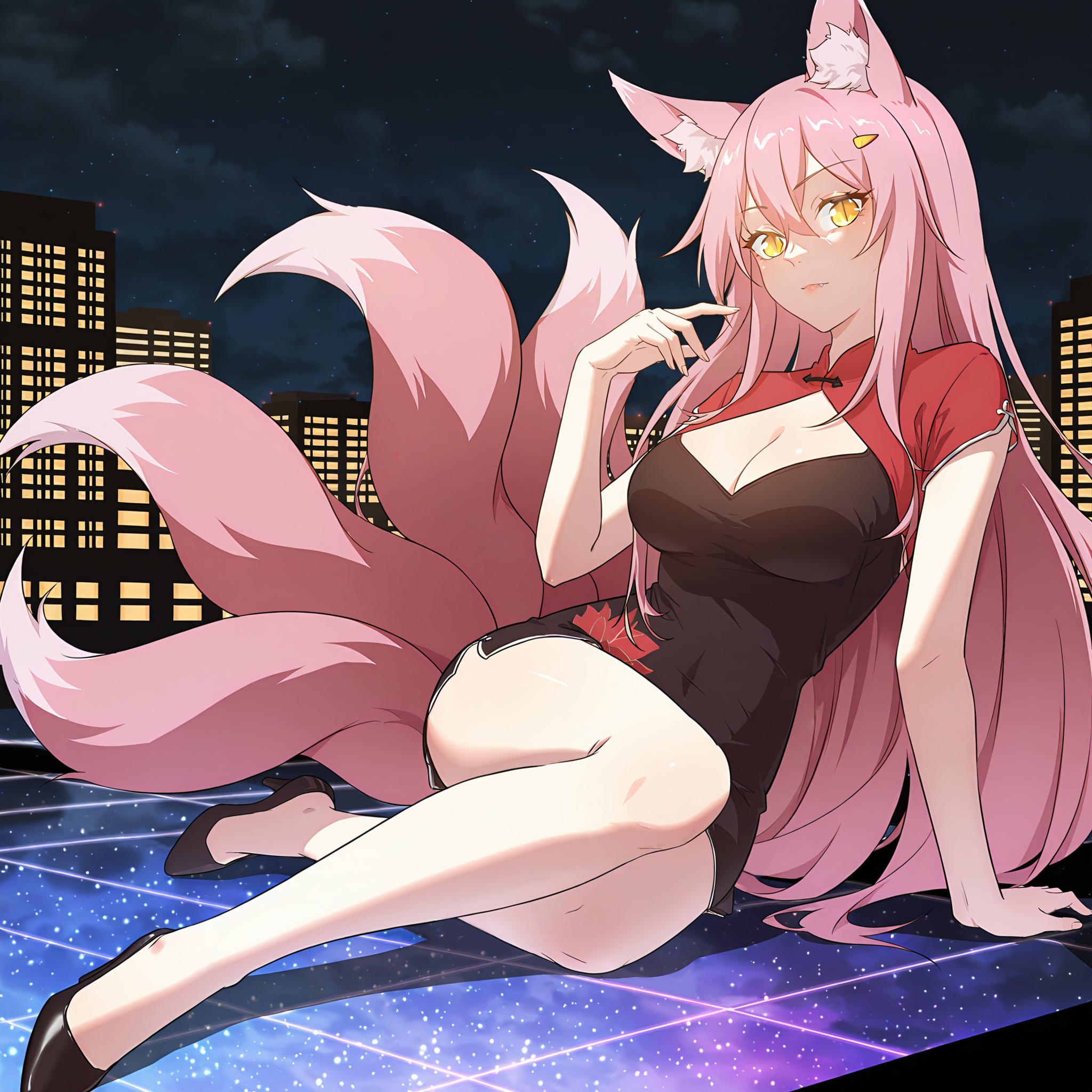 sujiuer、長いピンクの髪、黄色い目、縦に細く伸びた瞳孔、狐の耳、ピンクの狐の尾、