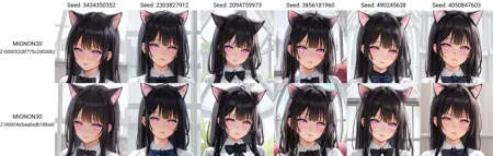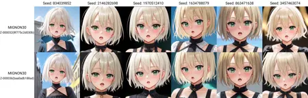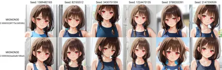 今回のトレーニングセットは、Pixivのmignon先生が描いた極めて高品質なイラストを使用しています。mignon先生が描く人物の顔の細部、特に目の描写は非常に特徴的です。しかし、作者の技術的制約により、LoRAはポートレートのような近距離でのみ目の細部を比較的よく再現できます。カメラが遠くなると、輪郭上で類似性を大まかに保つことしかできません。