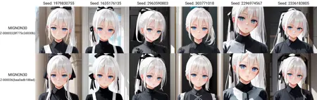 トレーニングセットは31枚の画像を使用しています。全身図13枚、頭部がフレーム外の図9枚、顔のクローズアップ9枚です。トレーニング時には、汎用キーワード「mignon30」に加えて、全身図には追加キーワード「mignonf13」、胴体図には「mignonb9」、顔のクローズアップには「mignonh9」を使用しました。