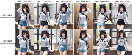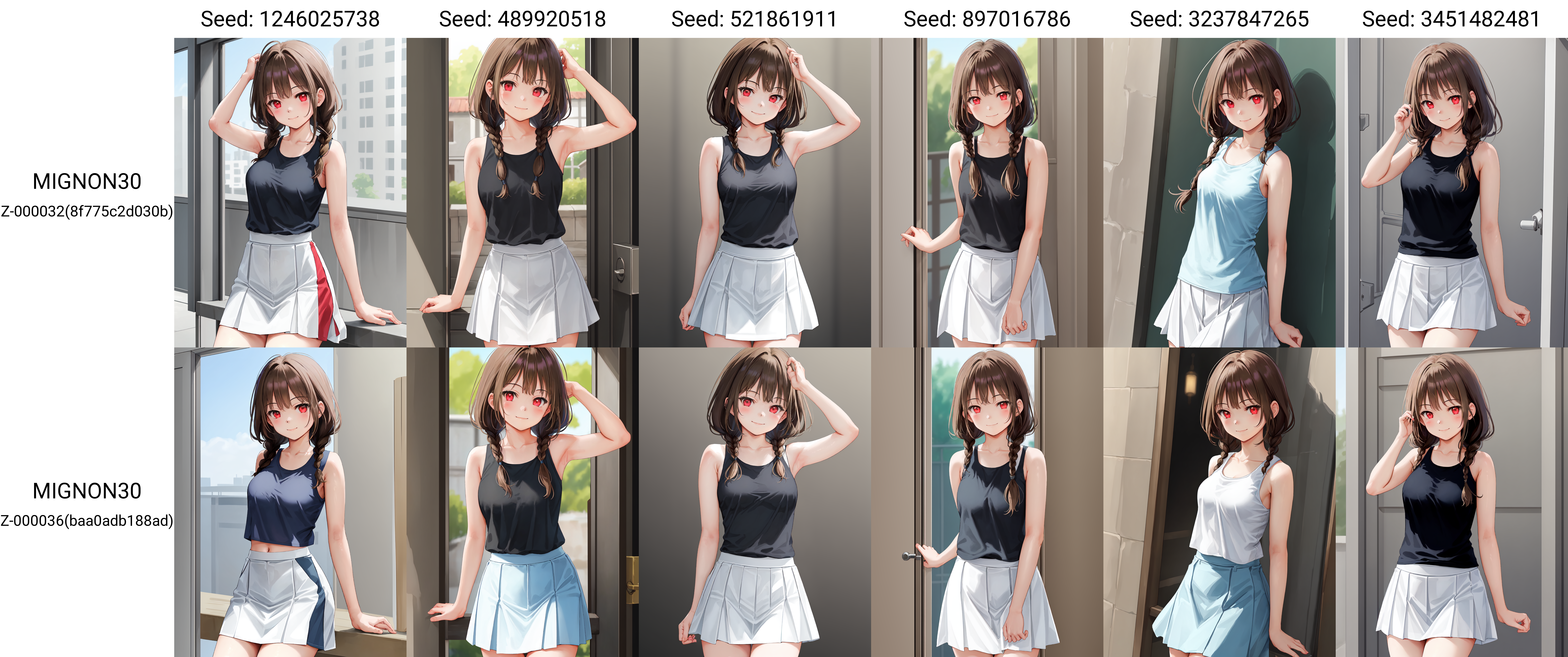 通常の描画、特に顔の描画時には「mignon30」と「mignonh9」を同時に追加できます。肌の露出面積が大きい場合は、「mignon30」「mignonb9」「mignonh9」の3つを追加するとよいでしょう。状況や要望に応じて調整してください。画像への影響はそれほど大きくないかもしれませんが、オリジナルのスタイルに多少近づきます。