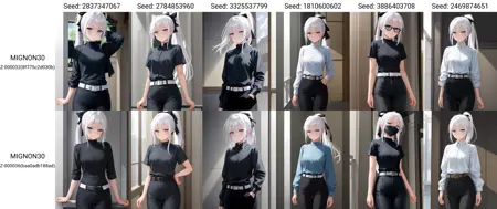 训练集共使用31张图:全身图13张、头出框图9张、面部特写图9张。训练时除通用关键词“mignon30”外,全身图额外添加关键词“mignonf13”,躯干图添加“mignonb9”,面部特写添加“mignonh9”。