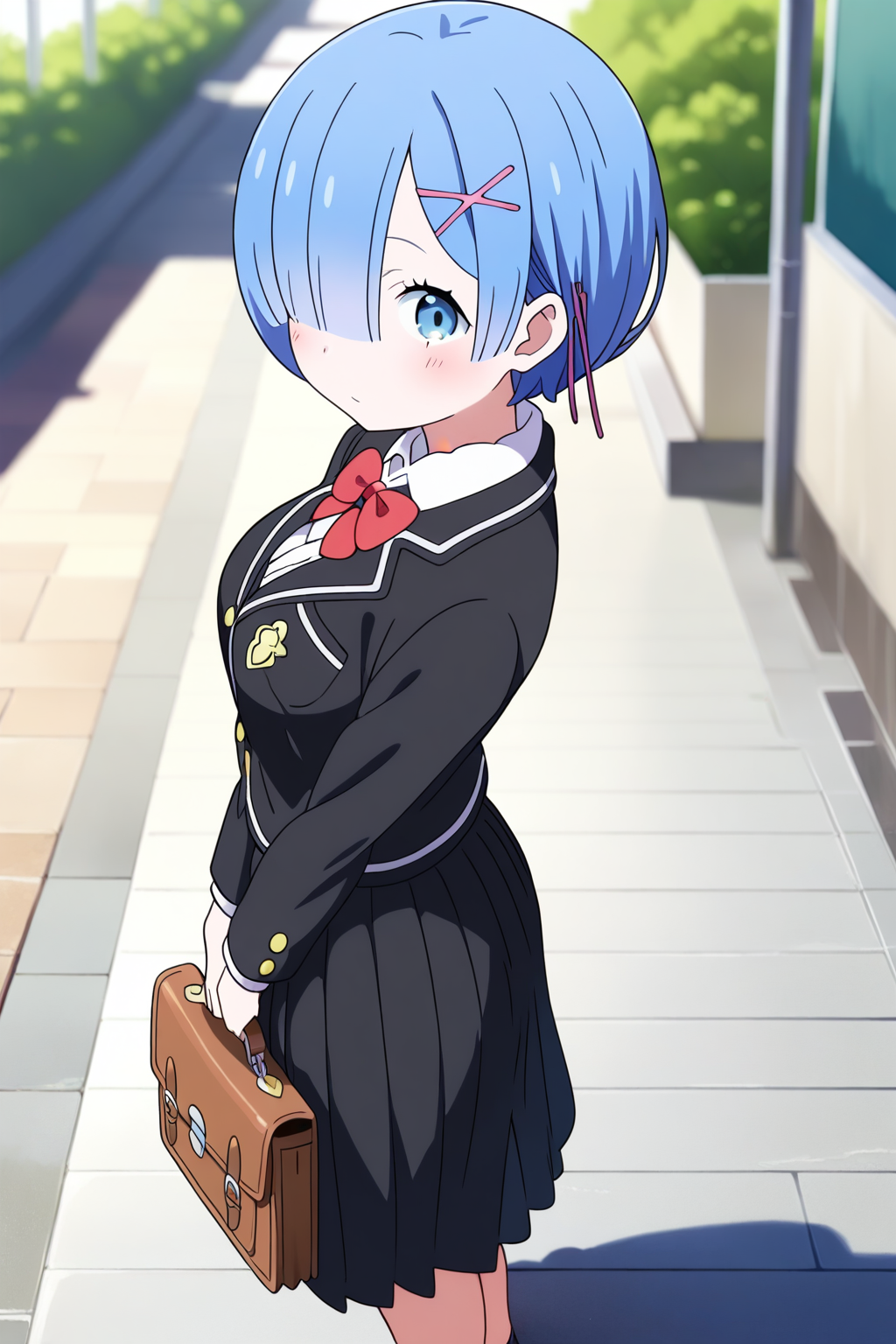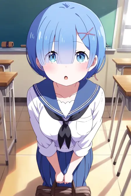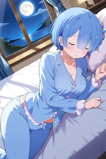 提示词:杰作,最佳质量,惊人的质量,精细细节,Rem,单人,胸部,中等大小胸部,短发,蓝发,刘海,头发遮住一只眼睛,蓝眼睛,